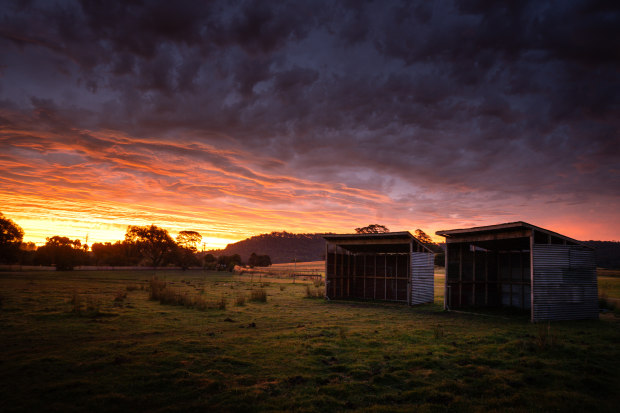 Beautiful dusk light over some horse shelters on our farm in Northern Tasmania.