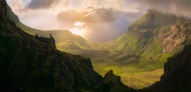 Last of the days light in the temperamental Faroe Islands. After a huge day of hiking I made myself stop in at one more spot before heading back home to eat and sleep. After a day of low cloud, this was one of the wildest scenes I.ve ever laid on eyes. The mountain peak behind me creating a small window in the clouds, giving me a perfect window to watch the sun set behind the distant fjords. I tried my hardest to put a scale to this gigantic landscape and capture the beauty that was in front of me.
