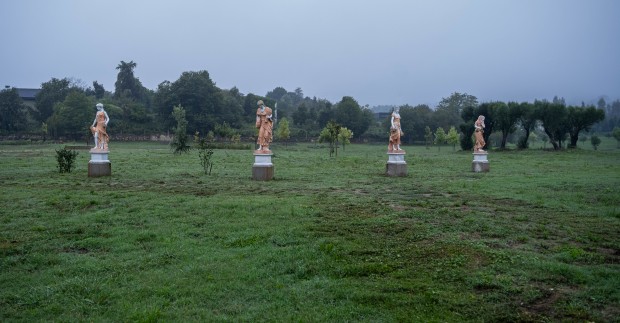 In rural northern Portugal, classical statues stand within an open field as low morning fog compresses distance and softens the orchard beyond. The subdued light flattens colour and scale, allowing form, placement, and atmosphere to define the landscape.