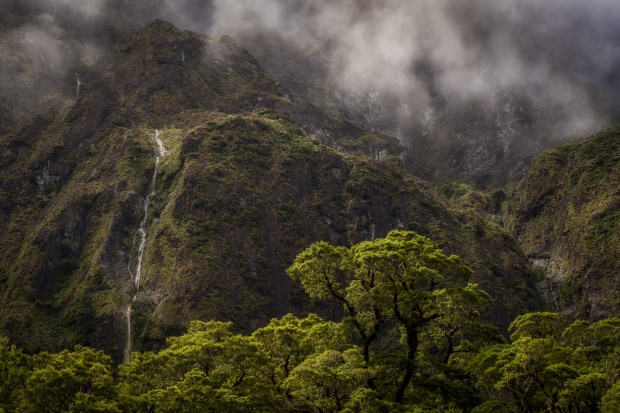 Magical mist descends from the high mountains into the ridges above beech forest of Fiordland, as temporary waterfalls cascade down the hillsides.