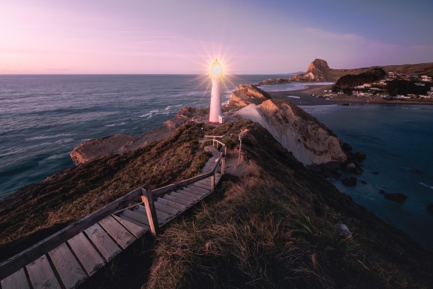 At Castlepoint coast, I captured the first moment of the sunrise as it met the last light of the lighthouse before it was put to rest for the day.