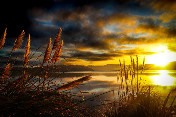 The landscape was breathtaking as the sunrised In the horizon, casting a warm glow over the inlet.