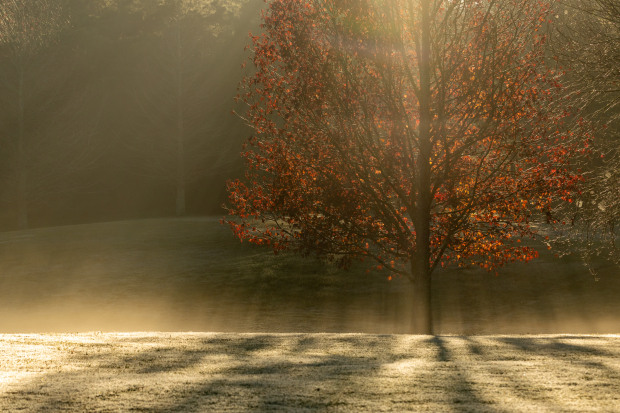 A quiet moment at first light, where frost clings to the ground as the rising sun breaks through the mist.