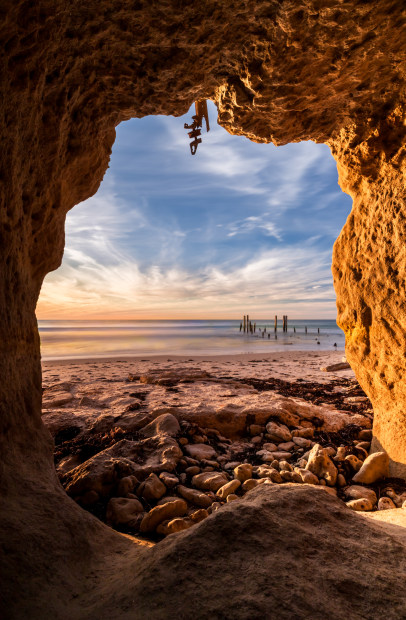 The old jetty ruins at Port Willunga in South Australia look always incredible in the setting sun. I also like to capture them from one of the caves carved out in the surrounding cliffs. The natural framing and the glow of the cave walls give the scene a magical touch.