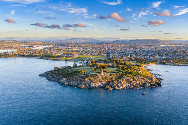 A Birds Eye view from the sea, across Mersey bluff and Devonport, towards Mt Roland and Cradle Mountain.