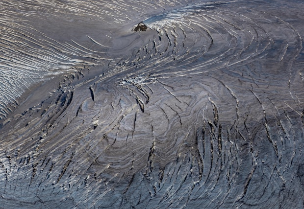Textures from the folding and shearing under its own weight of this massive Icelandic glacier. Appearing rigid and frozen, the surface maps the strain from the basal flow and gravity combined.