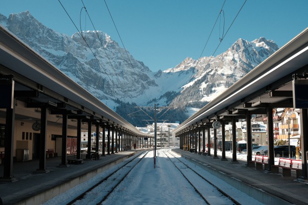 This photograph captures the breathtaking mountains surrounding Mt. Titlis, framed by the symmetry of Engelberg Station.