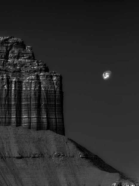 This image was made in Goblin Valley Utah, as the moon descended into a clear morning sky. Early sunlight begins to strike the rock formation, defining its surface and mass while the moon lingers above the horizon. The monochrome treatment simplifies the scene to form, light and negative space. By removing colour, the composition focuses on the relationship between permanence and transience, geological structure contrasted with celestial movement. The photograph captures a brief alignment of scale and timing within a landscape shaped by vast spans of time.