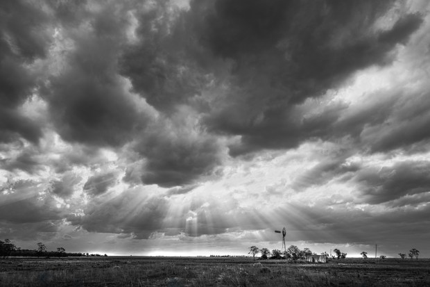 A barren paddock with a smattering of left over cotton missed by harvest and a windmill and a tank with the rays holding promise of a shower after a very hot day just outside of Dalby Qld Australia. The black soil heats unmercifully holding the temperatures high until well into the evening and causing a humidity that allowed the rays to be seen easily for some time. The clouds held good to their promise unloading huge amounts of rain later that evening.