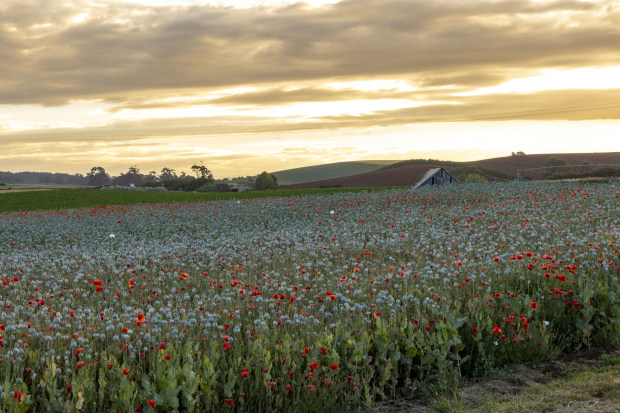 A field of poppies beneath a golden evening sky.