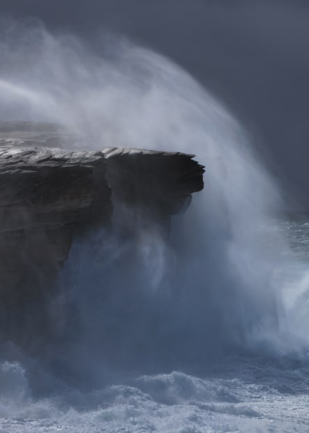 This work is part of a project on a treasured and favourite section of sandstone cliffs. In March 2025 a deep east coast low in the Tasman sea gave rise to a massive southerly swell and 50 knot winds tearing up and over the 30 metre cliff faces. The epic conditions while technically challenging presented a brilliant opportunity, and for me truly encapsulated the essence of landscape photography.