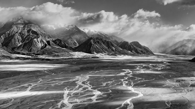 Taken through the front window of a helicopter heading up the Tasman River delta towards Mount Cook in New Zealand