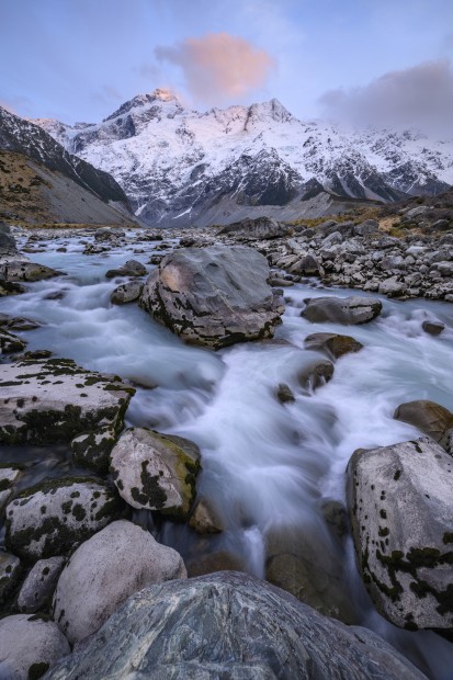 The fast-flowing Hooker River at dawn flowing down the Hooker Valley below Mount Sefton, in Aoraki/Mount Cook National Park, New Zealand