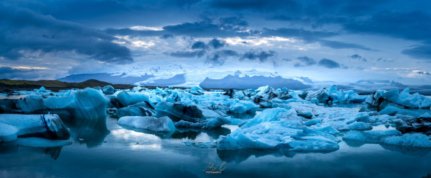 I took 5 images for this panorama of Jokuslsarlon, Ice Lagoon in Iceland. The image has various layers with the floating ice and the glazier at the back with a moody backdrop.