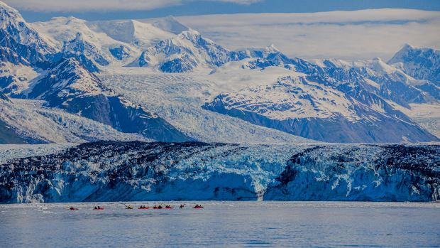 Kayakers at College Fjord, Alaska are dwarfed by the glaciers and mountains of Wrangell-St. Elias National Park
