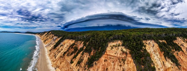 On Christmas Day, a shelf cloud moves across the coast, its scale dwarfing the shoreline below. Seen from above, the image captures the brief, uneasy calm before impact.