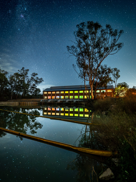 At Kings Billabong, Victoria, a water pumping station transforms at night. Long exposure, reveals hidden coloured light spilling from its windows, mirrored in the billabong, beneath a canopy of stars.