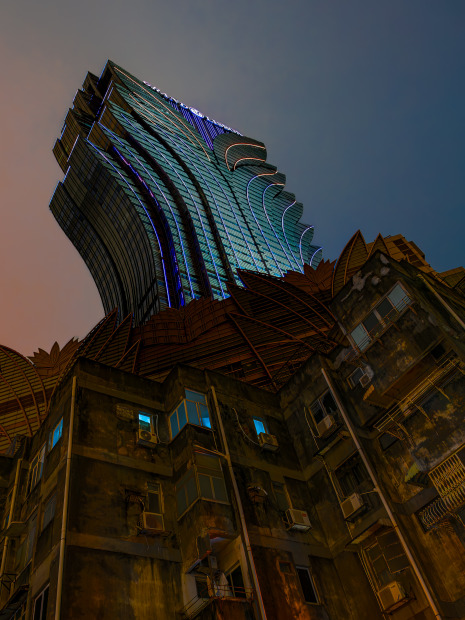 A shot of Grand Lisboa casino in Macau taken at night, in the foreground is a block of old apartments lit by the glow of orange street lights - the blue glow of a television mimics the blue lit casino tower above.