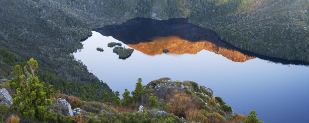 A perfectly calm Dove Lake reflecting the sun-bathed ridge line of Marion's peak in Cradle Mountain National Park. Panorama