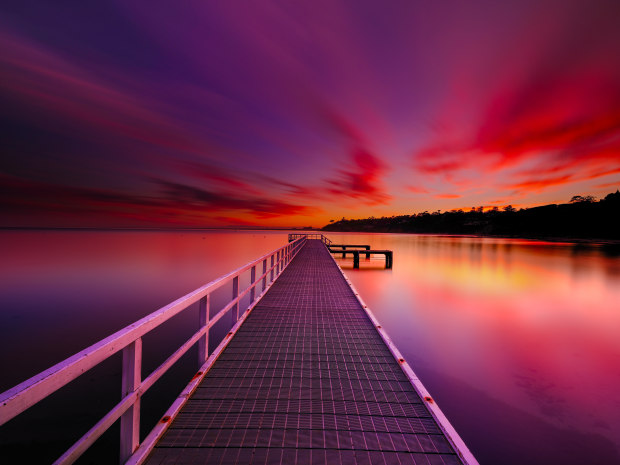 At sunrise, a long exposure smooths the water into a reflective calm as the jetty leads the eye toward the horizon. The sky ignites in layers of crimson, violet, and gold, its motion recorded as soft streaks of light above the still sea. The image explores the meeting of structure and flow, capturing the quiet intensity of the day’s first light as it unfolds across water and sky.