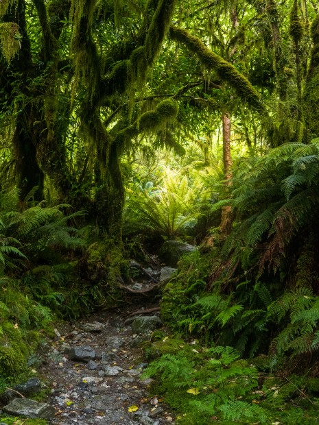 New Zealand's Fiordland National Park is a lush canopy of moss draped trees towering over lush ferns. The vegetation appears to glow in the soft filtered light. The forest immerses you in a living world of rich luminous green.