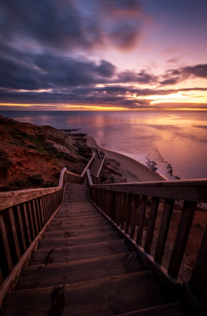 I frequently travel to one of the best locations for sunset photography in South Australia - the iconic lookout with long stairs leading down to the beach at Southport. This place, with an instant leading line in a composition, offers a spectacular view. Whether it's an amazing colourful sunset or a gloomy grey sky, we almost can't go wrong with our shots there!