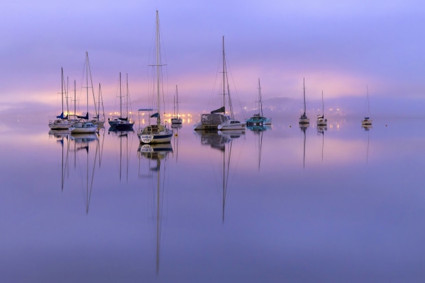Pre dawn on Brisbane Waters, Central Coast NSW captured on a windless day break with background fog causing the yaghts and reflections to leap out at the viewer.