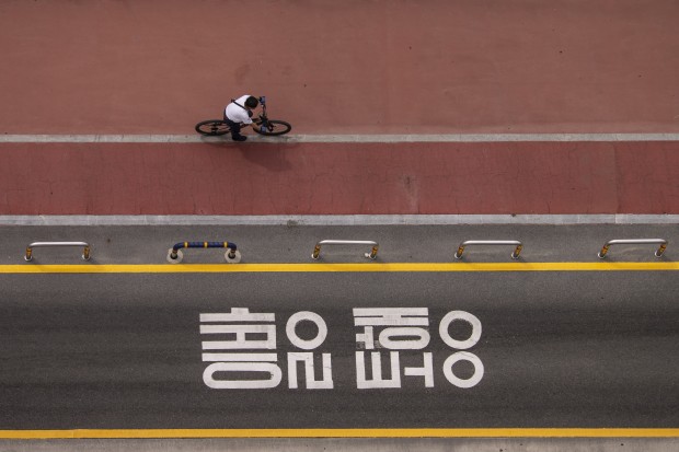A cyclist moves along a vivid red oceanside cycle path in Busan, Korea, captured from a high-rise building. Bold yellow lines and repeating steel barriers create a striking tapestry of geometry and symmetry — echoed by the angular forms of the Korean Hangul script painted on the road below.