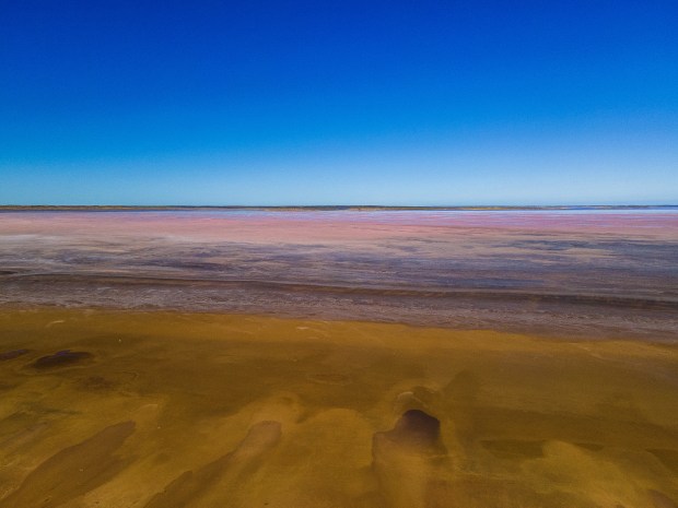 The northern tip of Lake Tyrrel where the waters have receded leaving caramel sand and pink salt deposits.