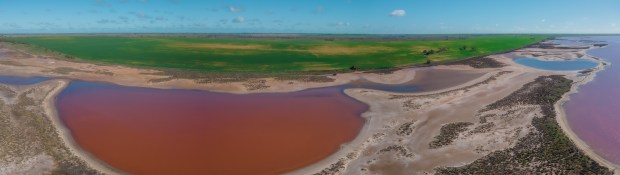 Stitched panorama highlights the renowned pink waters of the Salt Lake as it changes colour according to the depth of the water.