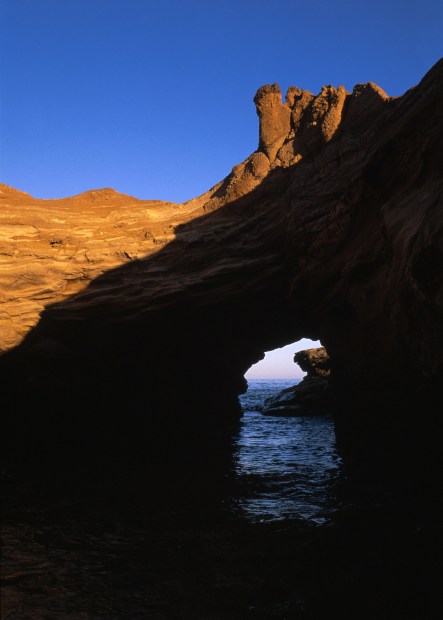 This exposure was made just after 8pm on December 17 2025 at Urquhart Bluff, between Aireys Inlet and Anglesea on Victoria's Surf Coast. The late evening sunlight gave the sandstone an incredible orange glow. I knew that the sunlit orange sandstone against the blue sky, with the ocean in shadow would work well on Fuji Velvia 50. The shadows were moving quickly as the sun set, but I'm happy with how the open tunnel into the ocean is framed by the shadow cutting diagonally across the scene, balanced by the sunlit upper left of the image. Canon EOS 7s (30V) Canon EF 35mm f/2 IS Fujichrome Velvia 50 The transparency was scanned using a mirrorless camera & macro lens then edited in Lightroom.
