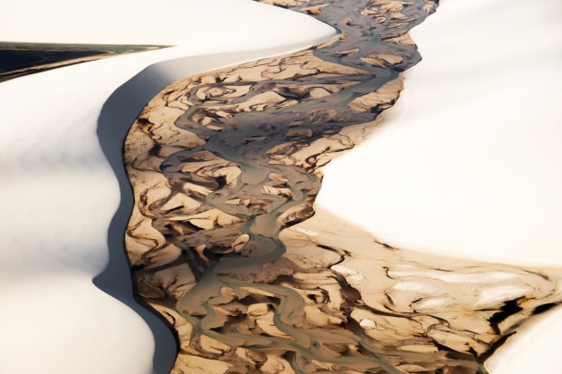 Tannin-colored, dark waters in Lençóis Maranhenses National Park come from the Rio Negro (Black River), which snakes through the vast expanse of white sand dunes in northern Brazil. This image was taken from a light plane.
