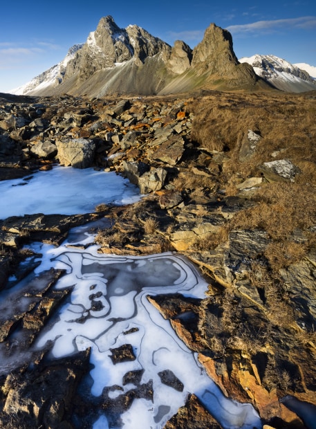 Vertical image of Estrahorn in Iceland with ice detail in the foreground