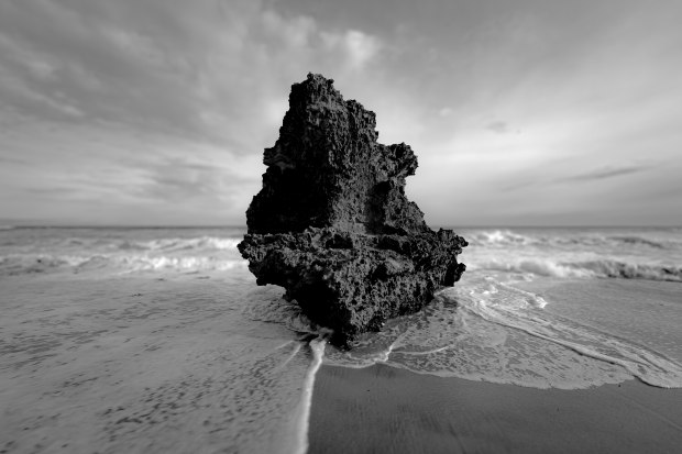 Dragon Head rock at Number 16 beach, Rye, Victoria. Canon 5DMKII | Canon 14mm 2.8 lens. Joby lightweight tripod placement and framing upon incoming waves. Black and White treatment and export via Adobe Lightroom