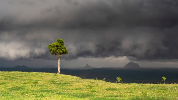A dark and foreboding storm front approaches a lone tree bathed in fleeting light
