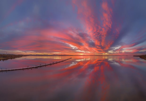 Long Jetty at sunset with glassy water for beautiful reflections of the amazing colourful clouds.