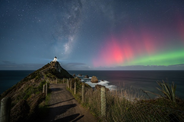 What an amazing night this was! Under a half moon, watching the Milky Way rise over the Nugget Point Lighthouse in New Zealand, while the Aurora Australis danced off to the right was a night I will never forget, so special.