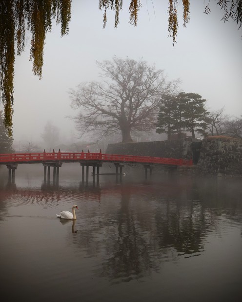 While visiting the beautiful Matsumato Castle in Japan at sunrise, mist suddenly rolled in across the moat, and a swan emerged to glide in front of me.