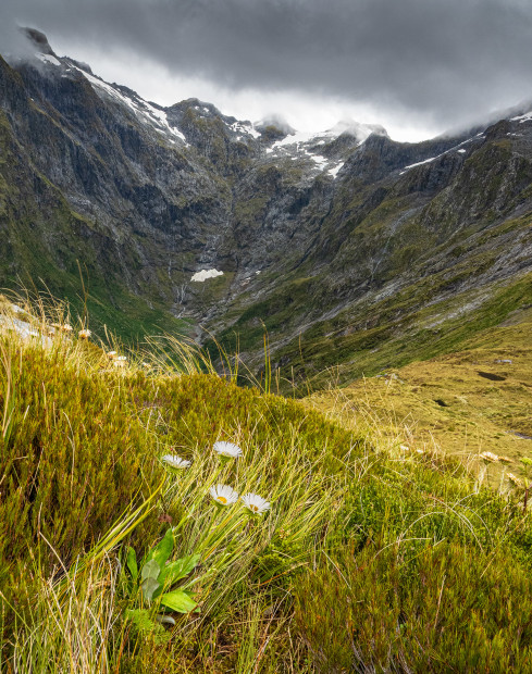 On a recent trip to New Zealand's Fiordland National Park I was blown away by the towering snow dusted peaks and wide valleys stretching below. There were wild daisies all over the pass adding a burst of white and gold against the ancient rugged landscape.