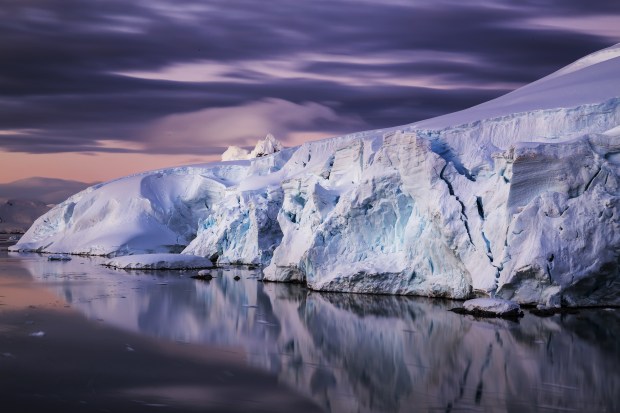 In the Antarctic summer the sun sets around midnight and dawn breaks a couple of hours later. It never really gets dark. This photo captures the glowing light and colour on a mass of rock and ice that looks to me like a sculptural made of meringue. The ice is not static and changes form and shape continually.