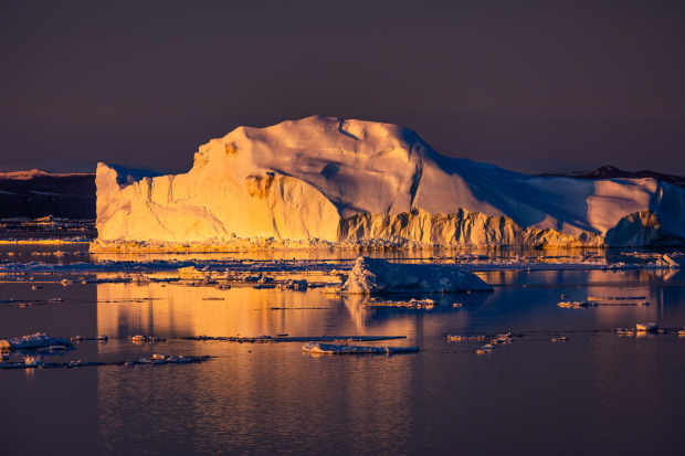 Its virtually 24 hours of daylight in Antarctica and late in the evening the sun casts a golden light over a very large iceberg.