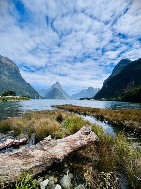 Old driftwood frames Mitre Peak, a 2000m tall rock in the middle of Milford Sound. From ground level this peak looms like a dinosaur from the Jurassic era - the water is just as deep underneath.
