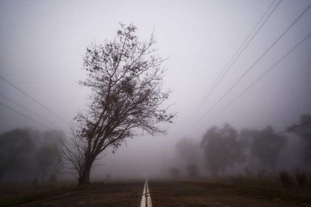 An old, deserted road shrouded by fog, fading into the distance and the past, fading from space and time.