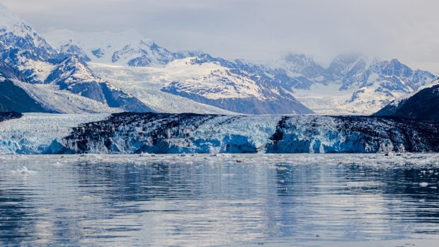 As the clouds roll in, the mountains of Wrangell-St. Elias National Park loom over a glacier at College Fjord, Alaska.
