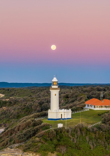 Moon setting above Norah Head Lighthouse. Taken with the telephoto lens from the drone, at sunrise. Capturing the beautiful pastels in the western sky.