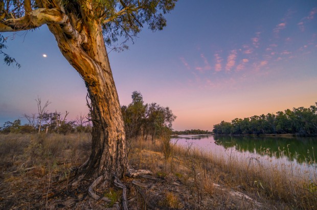 The moon rises as the sun sets, and casts magic over the Murray River Scene. The glowing Red Gum contrasts the gradient sky. A moment of pure beauty and stillness typical of the Murray River