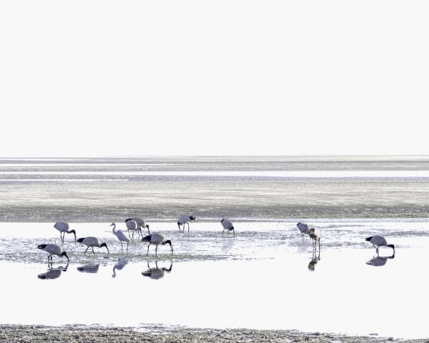 On low tides at Nudgee Beach, Brisbane, birds feed on the mud flats