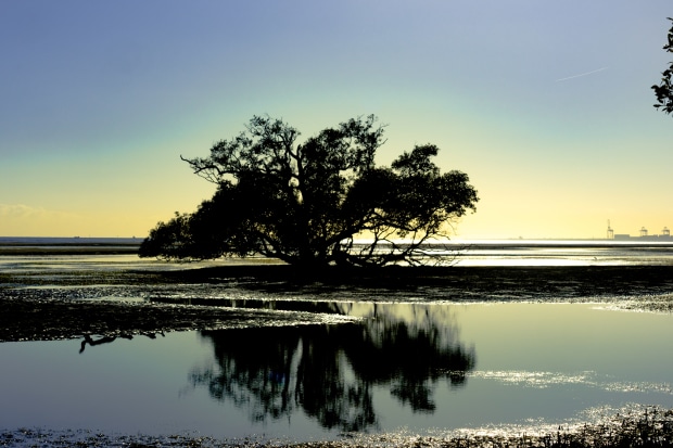 A mangrove in morning light with hint of the Port of Brisbane in the distance.