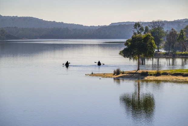 During an early walk at Lysterfield Lake, I noticed two kayaks slicing peacefully through water.