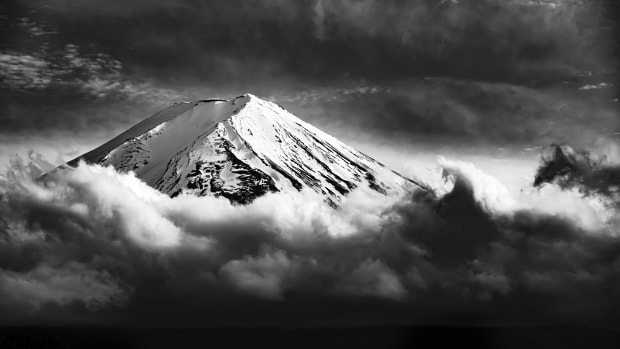 The top of Mount Fuji, Japan, towering above the moody cloud cover below